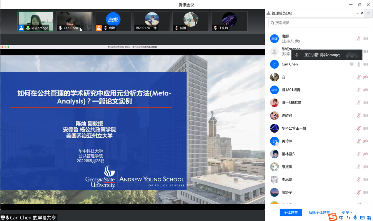 2022年5月25日上午,公共管理学院第二届“公共管理与政策前沿”工作坊第三期第二讲在腾讯会议举行,来自美国乔治亚州立大学的陈灿副教授为我院师生作以“如何在公共管理和公共政策的学术研究中应用元分析方法(Meta-Analysis)?:一篇论文实例介绍”为题的讲座,学院近八十名师生参加了讲座。本次会议由陈诚副教授主持。