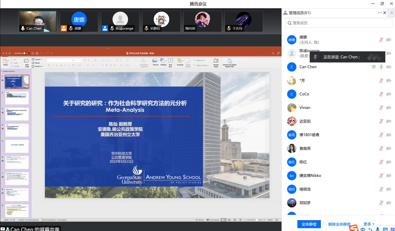 (通讯员 陈雨曦)2022年5月23日上午,公共管理学院第二届“公共管理与政策前沿”工作坊第三期第一讲在腾讯会议举行,来自美国乔治亚州立大学的陈灿副教授为我院师生作以“关于研究的研究:作为社会科学研究方法的元分析(Meta-Analysis)”为题的讲座,学院近八十名师生参加了讲座。本次会议由陈诚副教授主持。