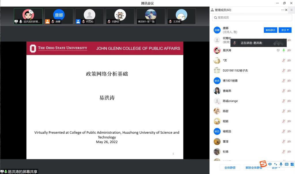 (通讯员 陈雨曦)5月27日上午,公共管理学院第二届“公共管理与政策前沿”工作坊第四期第一讲通过线上腾讯会议的方式举行。俄亥俄州立大学易洪涛副教授以“政策网络分析方法基础”为题,为我院近100名师生作精彩讲座,何青松副教授担任主持人。