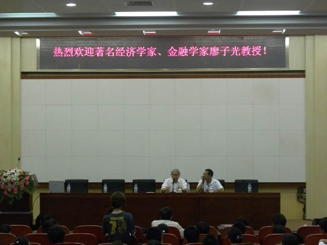廖教授知识渊博,不仅从学术方面将学子们引入到一个新的境界,同时他还提出了对中国目前诸多政策和现实的见解,譬如计划生育政策、广东外向型经济、大学生就业、贫富差距。廖教授对学子们提出了殷切期望:要多到企业去实践,要在实践中逐步实现自己的价值;要用批判的眼光,用自己的经验去验证现实,要敢于挑战权威。讲座结束之后,廖教授和同学们关于美国强迫人民币升值,工资是否能够带动经济增长,美国现在靠什么来拉动当前的经济增长等问题进行了深入的讨论和交流。