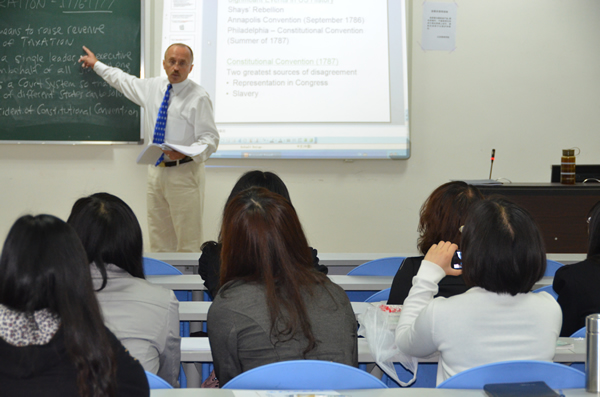 Joseph G. Krenitsky教授首先用正在学习的中文介绍自己的基本情况及此次讲座的主要内容,并与同学们分享“学无止境”的人生格言,其流利的中文与认真的学习态度引来同学们的惊叹。接着,Krenitsky教授结合其多年的研究经验与教学实践为在场的同学细致讲解了美国法律制度与政府体制。从美国独立战争到南北战争;从州政府到国家政府;从两院议会到两党执政;从联邦制到三权分立,Krenitsky教授以其独特的见解为同学们带来认识西方体制机制的新视角。最后是提问互动环节。Krenitsky教授与在场的师生在轻松愉快的氛围中,发表见解,相互交流。同学们用阵阵热烈的掌声表达对教授的感谢。