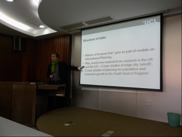 Nick Phelps教授任教于英国伦敦大学学院,该学校与英国牛津、剑桥、帝国理工、伦敦政治经济学院等4所世界一流名校一起被称为英国超级G5集团。Nick Phelps教授首先从他个人研究的兴趣开始,让我们领略在土地资源管理及城市规划专业的世界前沿,包括该领域世界顶级的大学、研究机构,并特别介绍了UCL和Bartlett规划学院概况及他们的研究重点,让同学们一下子感受到了国际前沿的概貌。
