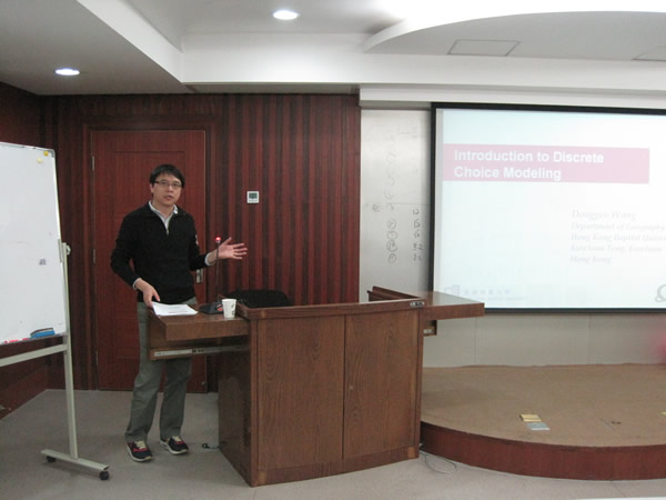 2010年12月20日晚,香港地理学会会长、《Asian Geography》主编、香港浸会大学地理系教授王冬根博士应邀来我院进行学术讲座与交流。主讲我院土地资源管理专业《土地资源管理》硕士生国际化课程,为我院土地资源管理专业全体师生奉献了一场题为“Discrete choice modeling of housing preference”的精彩学术报告。此次课程由我院李菁副教授主持。