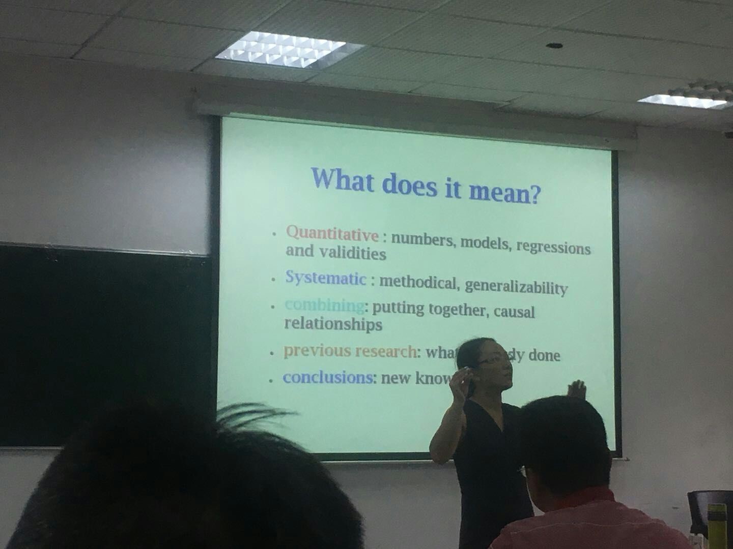 荟萃分析(Meta-analysis)是用统计的概念与方法,去收集、整理与分析之前学者专家针对某个主题所做的众多实证研究,希望能够找出该问题或所关切的变量之间的明确关系模式,可弥补传统的Review Articles的不足。苏徐红副教授介绍了Meta-analysis如何在人文社会科学领域进行应用以及应用实例,针对研究设想的来源、研究方法、模型构建和数据解析等方面给在座师生提供了很好的学术研究指导意见,激发了师生们的学术兴趣和热情。