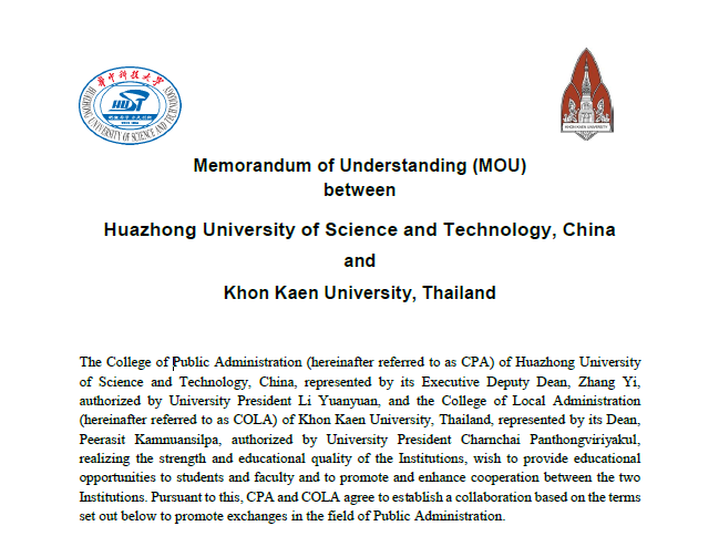 孔敬大学(Khon Kaen University),经泰国王批准始建于1964年,是泰国最著名的公立大学之一,在全泰国排名前5位,在行政管理、医学、工学等方面实力突出。地方行政学院(College of Local Administration)致力于提高政府的公共管理能力,拥有卓越的公共事务治理领域的教学和科研水平,创建了基于社区的跨学科学习和研究环境,帮助学生和教职员工培养应用知识服务社会的能力以及国际胜任力。泰国作为“一带一路”沿线国家,与中国有巨大的合作潜力,本次协议的签署有助于深化我校与孔敬大学在公共管理领域的合作交流,分享双方在公共管理中的实践和经验,推动中泰战略合作伙伴关系的发展。