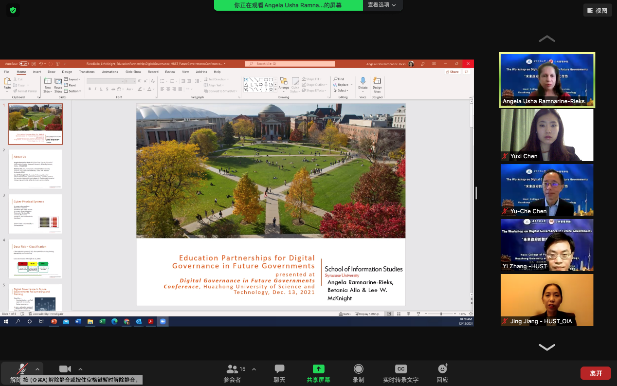 本次会议出席人员包括我校国际交流处副处长江静、公共管理学院常务副院长张毅教授、内布拉斯加大学奥马哈分校公共事务和社区服务学院和数字治理分析实验室主任Yu-che Chen教授、雪城大学马克斯维尔公民与公共事务学院自动系统政策研究所主任Jamie Winders教授、雪城大学信息学院Angela Usha Ramnarine-Rieks教授,以及多名相关领域的教师和研究生。会议由内布拉斯加大学奥马哈分校Yu-che Chen教授和我校张毅教授共同主持。