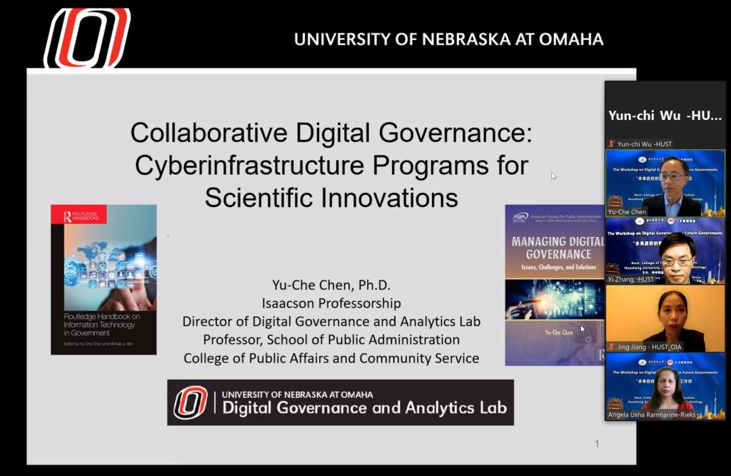 在讨论环节,各位专家学者围绕数字治理中的创新、智能技术在公共管理和公共政策领域的应用等话题进行了更深入的探讨,对未来合作研究方向及工作计划进一步交换了意见,同时探讨了在疫情防控常态化情况下,有关学生派出、交流及联合培养等方面存在的实际问题与对策。随后,内布拉斯加大学奥马哈分校Yu-che Chen教授和我校张毅教授分别介绍了内布拉斯加大学奥马哈分校数字治理分析实验室和我校决策剧场实验室。