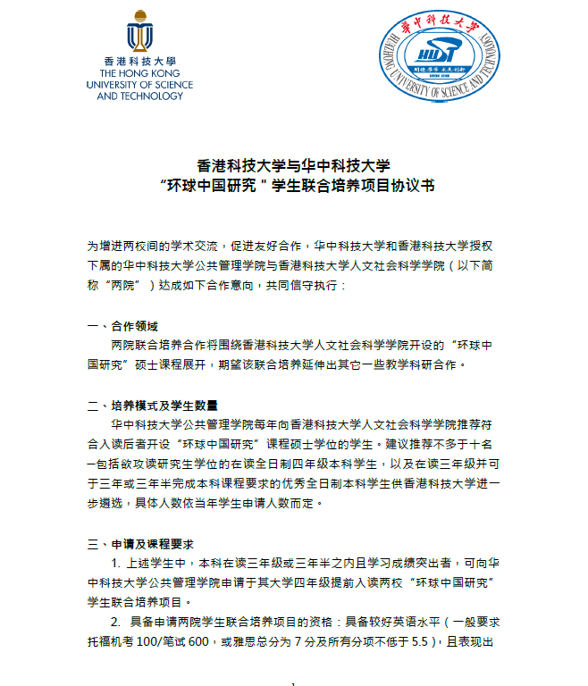 本次签署的学生联合培养协议围绕香港科技大学人文社会科学学院开设的“环球中国研究”硕士课程展开,我院每年向香港科技大学人文社会科学学院推荐不多于十名优秀全日制本科生入读该项目,其中本科在读三年级或三年半之内且学习成绩突出的学生,可向我院申请于其大学四年级提前入读。