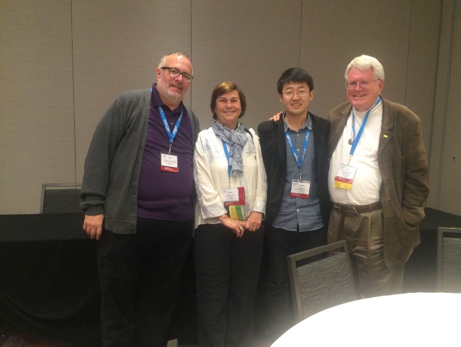 (于洋航博士生与德克萨斯大学埃尔帕索分校Bradley教授、International Academy for Interfaith Studies执行主席Cynthia E. Lynch教授、ASPA前任主席Thomas D. Lynch教授合影)