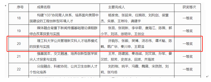 近日,第九届湖北省高等学校教学成果奖名单公布。我院许晓东教授牵头的研究成果“理工科大学公共管理新文科人才培养模式的探索与实践”荣获省级教学成果一等奖。