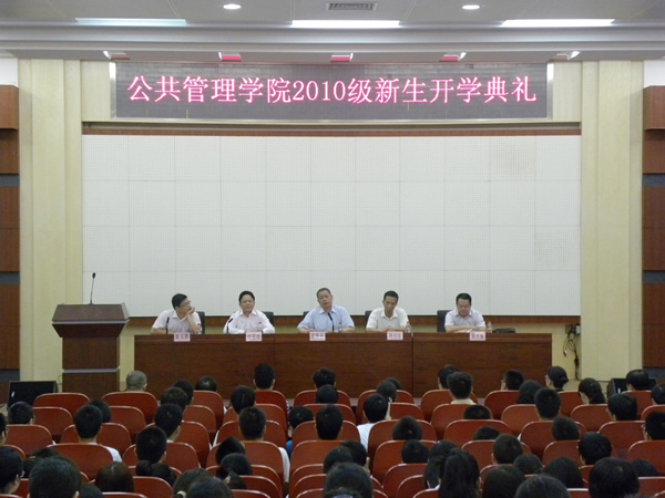 2010年9月7日上午9点,我院2010级新生开学典礼在院学术报告厅隆重举行。院长徐晓林教授、院学术委员会主席钟书华教授、副院长谭术魁教授、党总支副书记童文胜副教授、部分研究生导师以及2010级新生(含本科生、硕士研究生、博士研究生)参加了开学典礼。开学典礼由院党总支书记何流清同志主持。