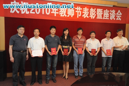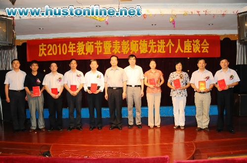 9月8日,为了迎接我国第26个教师节,我校召开了2010年教师节表彰暨座谈会,评选表彰我校2010年度“伯乐奖”、“三育人奖”、“三育人积极分子”和“学术新人奖”获奖者。我院卢新海教授、梨园医院文秀英等30人荣获“三育人奖”。校党委书记路钢博士、校长李培根院士出席了此次会议并为获奖者颁发了荣誉证书。9月10日,校工会庆祝2010年教师节暨表彰师德先进个人座谈会在工会报告厅举行,我院徐顽强教授、管理学院张金隆教授等10人荣获校2010年度十佳“师德先进个人”称号。校党委副书记欧阳康教授,校工会主席袁汉桥、教务处处长许晓东教授等领导出席了会议并为获奖者颁奖。