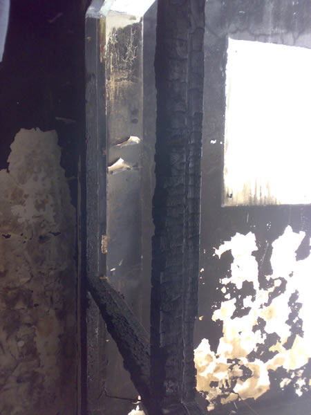 2009年3月8日,我校沁苑学生公寓一女生宿舍楼失火,宿舍内的所有物品全被烧毁,窗户被烧脱落,所幸因扑救及时,没有人员伤亡,也未蔓延到附近寝室。初步查出原因也是违规使用“热得快”引发(附上图:被火灾烧过后的窗户、墙壁和屋顶。上述三图均是火灾后清理了的,要不还要触目惊心。如图三所示,大火将屋顶的预制板都烧穿了,想想火灾当时的温度有多高吧!幸亏屋内没人!)。