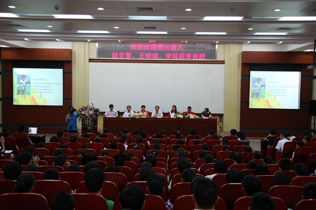 最后的互动环节将见面会的气氛推向了高潮,“运动员需要承受巨大的压力,学生也要面对压力,在应对压力上你们有什么指导建议呢?”、“现在已经站在巅峰了,未来的职业规划是怎样的呢?”、“在华科大六十年校庆之际有什么寄语吗?”等等问题让现场气氛活跃不已,一问一答中,掌声、笑声、欢呼声不断。看着同学们的积极与热情,赵芸蕾、王晓理、李锐三位运动健儿不约而同地表示非常向往与羡慕校园生活,同时为自己是华科大的学子感到自豪。她(他)们同时表达了对母校的祝福和殷切希望,希望母校能越来越好,同时自身也会用更优异的成绩回报母校。健儿们表示,虽然现在不能享受校园生活,但期待着能和同学们一起相互学习,专注坚持的读书时光,不断充实自己。