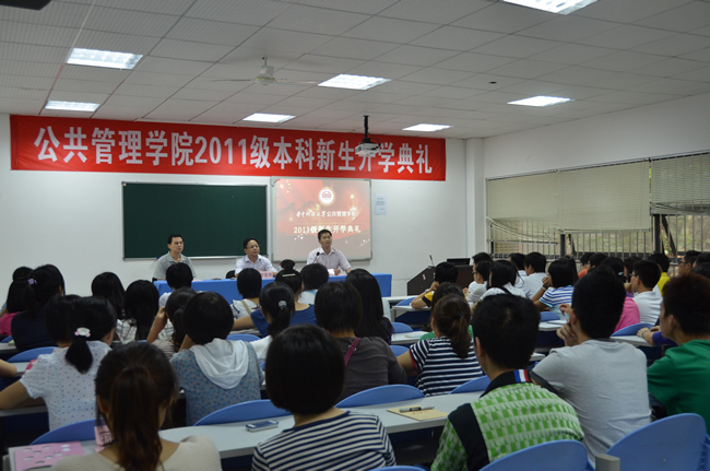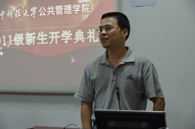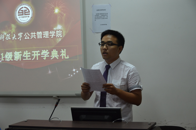 下午3点,新生典礼正式开始。党总支书记何流清首先致辞,他表示热烈欢迎2011级的新同学加入公管学院,并对新生提出希望——做一个有理想的人。此外,他还强调,“大学生肩负中华民族伟大复兴的历史责任,理想要丰满,现实也要丰满。同学们要在大学中历练自己,以学业为重,学会为人处事之道,享受美好大学生活”。何书记还从专业排名等方面介绍了学院的概况,展示了学院深厚的发展实力。