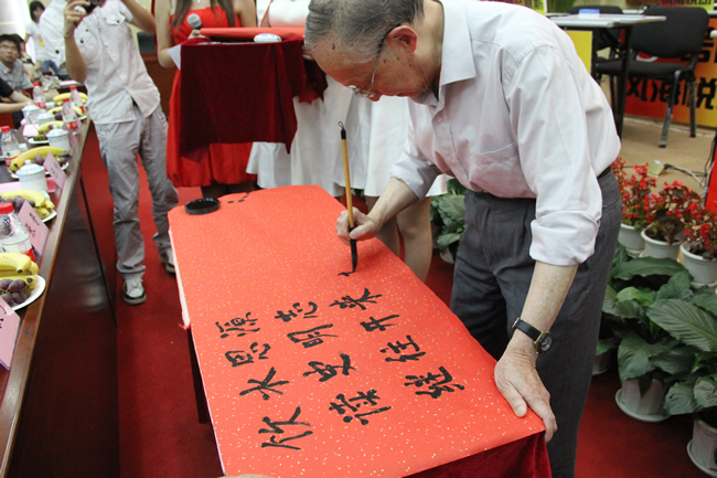 值得一提的是,校史知识竞赛总决赛还特别设置了一个环节——杨叔子院士题词,杨叔子院士写下“饮水思源,读史明智,继往开来”十二个字,这不仅是对校史知识竞赛的总结,也是他对同学们的寄语与希望。看到杨老的题词,在场的同学们万分感动,高举写有本次校庆活动主题“融汇、传承、跨越”的标语牌,集体起立向杨老鼓掌致谢。