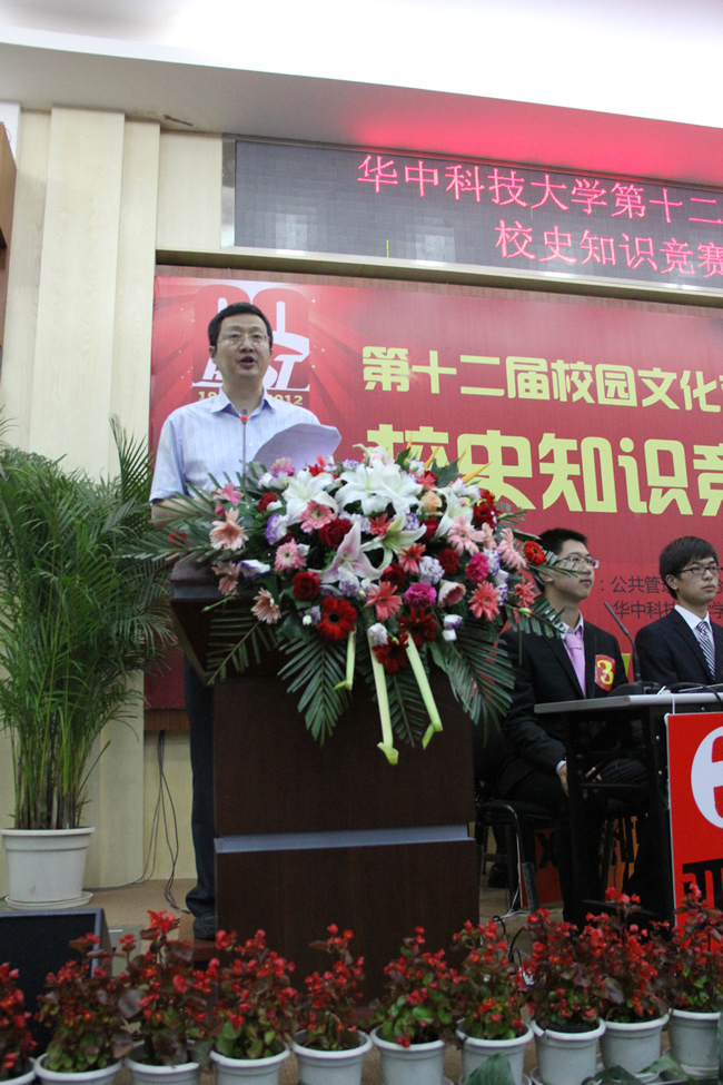 在两位主持人简短的开场词后,由张晋副校长为本次大赛致辞。张晋副校长简单回顾了华中大六十年的发展历程,并表示“学校在建设发展的每个时期所产生的重要事件、重要人物、重大成就积累成的史料所体现的重要的精神财富,是华中大人永世不忘的优良传统”。张晋副校长同时对参与此次活动的同学们提出了三点希望:首先,希望同学们把胡锦涛总书记在纪念清华百年校庆大会上的讲话精神和学习生活结合起来;其次,希望同学们把个人成长、成才与华中大的发展结合起来,把对母校的爱转化为提高自己的动力;最后,希望同学们把心中的激情与活力和六十周年校庆结合起来,积极参与校庆的各项活动。