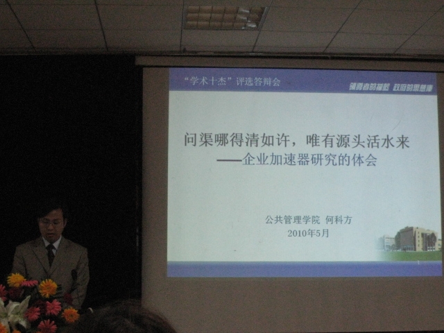 本次评选活动分四个阶段进行,分别是学术成果汇总、学术方法分享、个人风采展示和学术作品答辩。在个人风采展示阶段,何科方、李华君分获“商业实践才能”第一、二名,曾润喜获得“社会活动才能”第一名;在学术作品答辩阶段,何科方以“问渠那得清如许,为有源头活水来——企业加速器研究的体会”为题,感悟“学术研究如同采矿,越挖越深”,获得了在场评委的一致认可,以91.25的成绩斩获全场最高分。