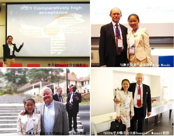 10月23日下午,李月在Panel C分会场做了20多分钟的主题报告,引起了在场学者的广泛关注,并引发了现场热烈的讨论。马来西亚学者Riant Nugroho认为对社会力量科技奖励的研究十分有意义,并分享了该国社会力量科技奖励与媒介紧密联系的发展经验。分会场主席美国哈姆来大学大学学者Wallace Swan评价李月的发言内容资料详实,充满新意,为国外学者了解中国科技奖励前沿研究开启了崭新的视角。会后,澳大利亚产业部部长Mike Woods、澳大利亚国立大学副校长Ian Chubb教授、ICPA学术委员会主席Donald C. Menzel教授等多位学者和教授对李月给予好评,称其以新颖的研究视角展示了国内公共管理研究学者的新风貌,并同她亲切合影留念。