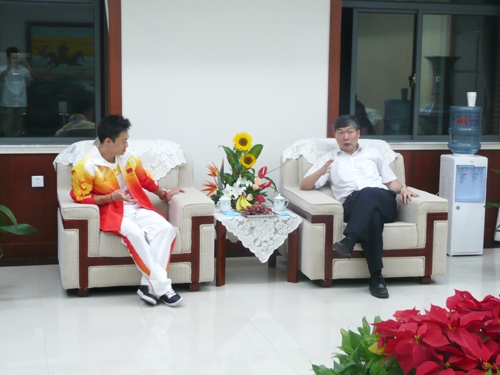 在见面会之前,校长李培根会见了杨威一行。李培根校长对杨威说,湖北人民为你感到骄傲,学校更为你感到骄傲。他指出,中国要成为真正的世界体育强国,不仅在于得到奥运金牌的多少,更重要的指标是运动员的文化素养。他希望杨威今后尽可能多一些时间在学校学习,和同学们相处,感受整个学校的氛围。杨威表示多在学校学习是一个必须的过程,现在需要做的是静下心来。