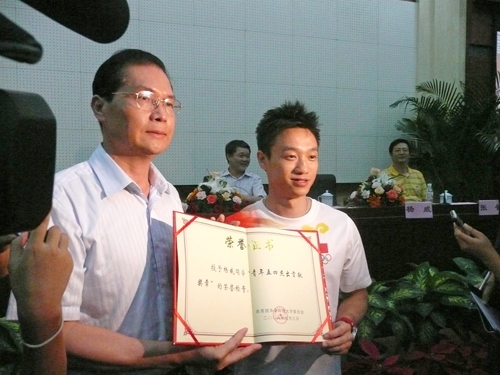 9月7日晚,近600人将我院三百多个座位的学术报告厅被围得水泄不通,刚刚从家乡仙桃返汉不久的杨威携未婚妻杨云回到学校,回到公共管理学院,与自己的老师和同学们见面。见面会上,学校授予杨威“青年五四杰出贡献奖章”,这是校团委授予在校学生的最高荣誉。