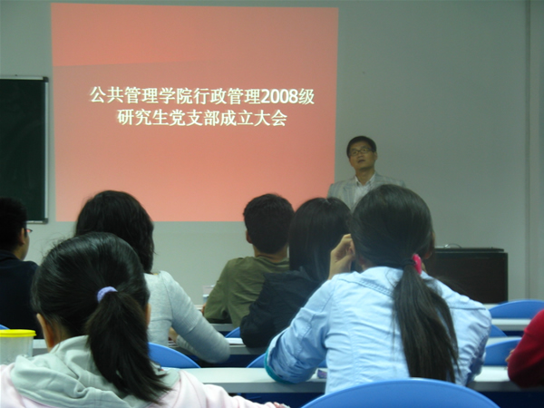 汪艳霞首先宣布,经学院党总支批准,行政管理专业2008级研究生党支部正式成立。随后,她简要介绍了本学期党支部的各项工作安排。她提出,党支部将有计划、有步骤地做好研究生党员发展工作,不断扩大党员队伍,将优秀的研究生吸收到党的队伍中来,群策群力,把支部建设成全校优秀学生党支部。