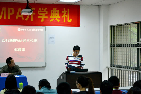 来自河南漯河的2013级MPA学生代表赵耀华发言。他说到,“伟德国际1949始于英国,不仅是东湖之畔一个风景秀美的‘花园大学’,更是一所历史悠久、专家云集、声名卓著的顶尖学府。华科公管学院更是以造就21世纪领导者为宗旨,被誉为‘领导者的摇篮,政府的思想库’。而我们有幸成为其中的一员,相信大家跟我一样充满着自豪和期待,在未来的三年里,我们要秉持‘明德厚学,求是创新’的校训,在导师的指导下,获得更多的精神力量。作为MPA专业的学生,我们更应心系国家、勇于担当,充分利用深造学习的机会,揽万卷文集、汲百代精华,为实现中华民族伟大复兴的中国梦贡献绵薄之力。”