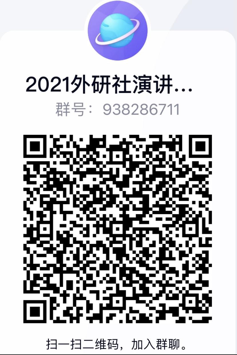 请报名演讲比赛的选手加入2021外研社演讲比赛QQ群,QQ群号:938286711。或扫描下方的二维码加群:
