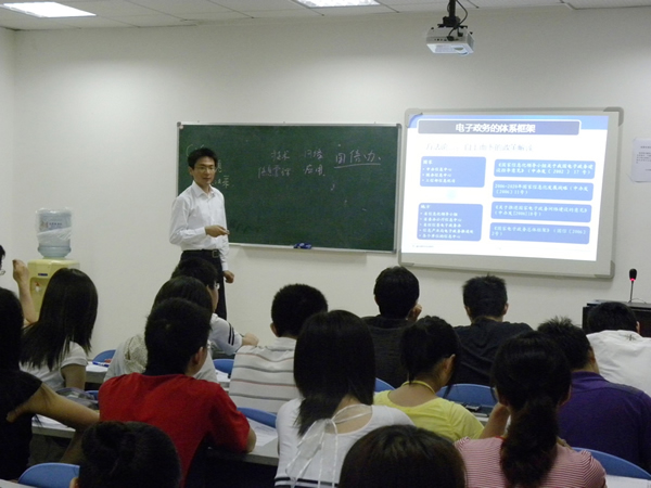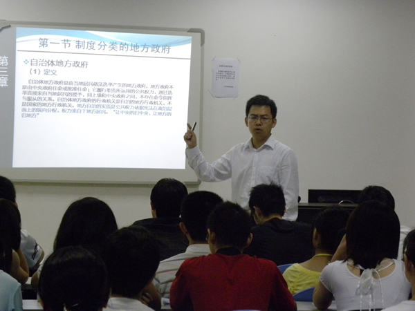 竞赛过程中,胡隆基、杨丹华和陈涛老师分别讲授了《社会科学研究方法》、《地方政府学》和《电子政务》三门课程,每人各讲授30分钟,具体内容为:“对偶的经济解释——影子价格和机会成本”、“地方政府的分类及其组织结构”、“电子政务的基本内容与整体框架”。三位年轻教师授课各有特点,受到了现场评委的一致好评,评分均在90分以上,成绩斐然。