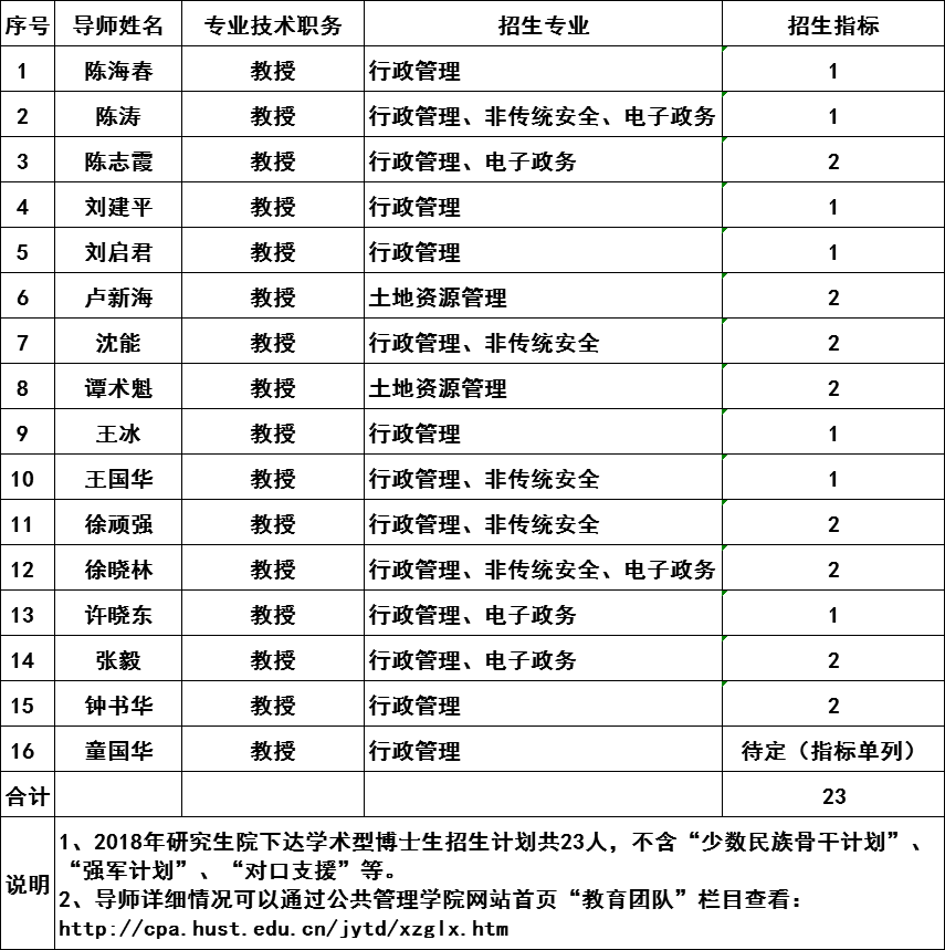 经教师个人申报,系办公室初审,院学位审议委员会进行导师招生资格审议。院研究生招生领导小组根据《公共管理学院学术型研究生招生计划分配方案》,结合学校下达的招生计划,对2018年可以招收学术型博士生的教师招生指标进行了协调分配。现公布如下,供导师和研究生进行双向选择。