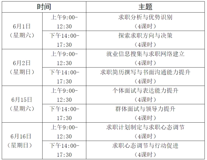 培训课程紧密围绕大学生职业生涯发展和就业创业现实问题,以促进就业意识、转变就业态度、推动就业行动、提升就业能力为课程目标,以标准化、个性化、定制化、实践化为培训内容导向,具体培训安排如下:
