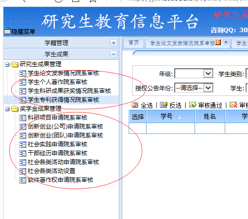 2、进入之后,点击学生成果,分别在“研究生成果管理”和“奖学金成果管理”里填写自己获得的成果,没有就不填。干部经历证明人填写我的工号:2016210136.成果不一定需要一次传完,分批上传也是可以的。