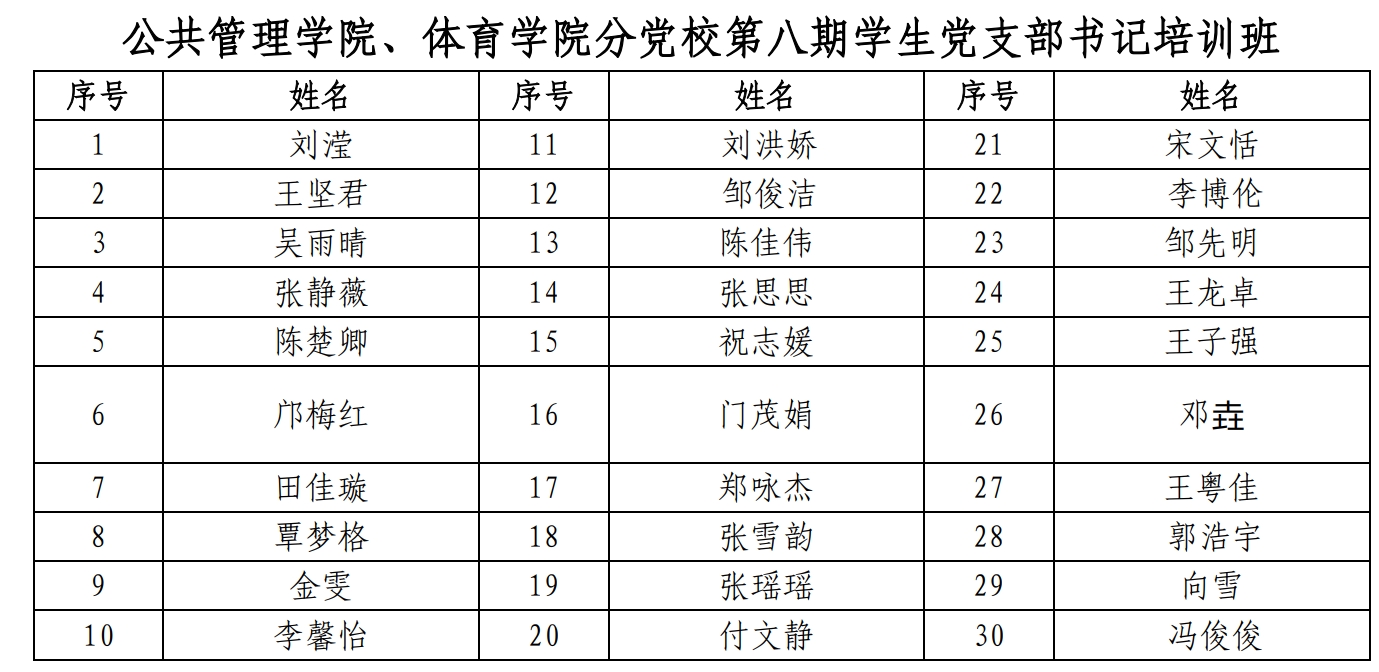 本期学生党支部书记培训班共有学员30人,人员名单如下: