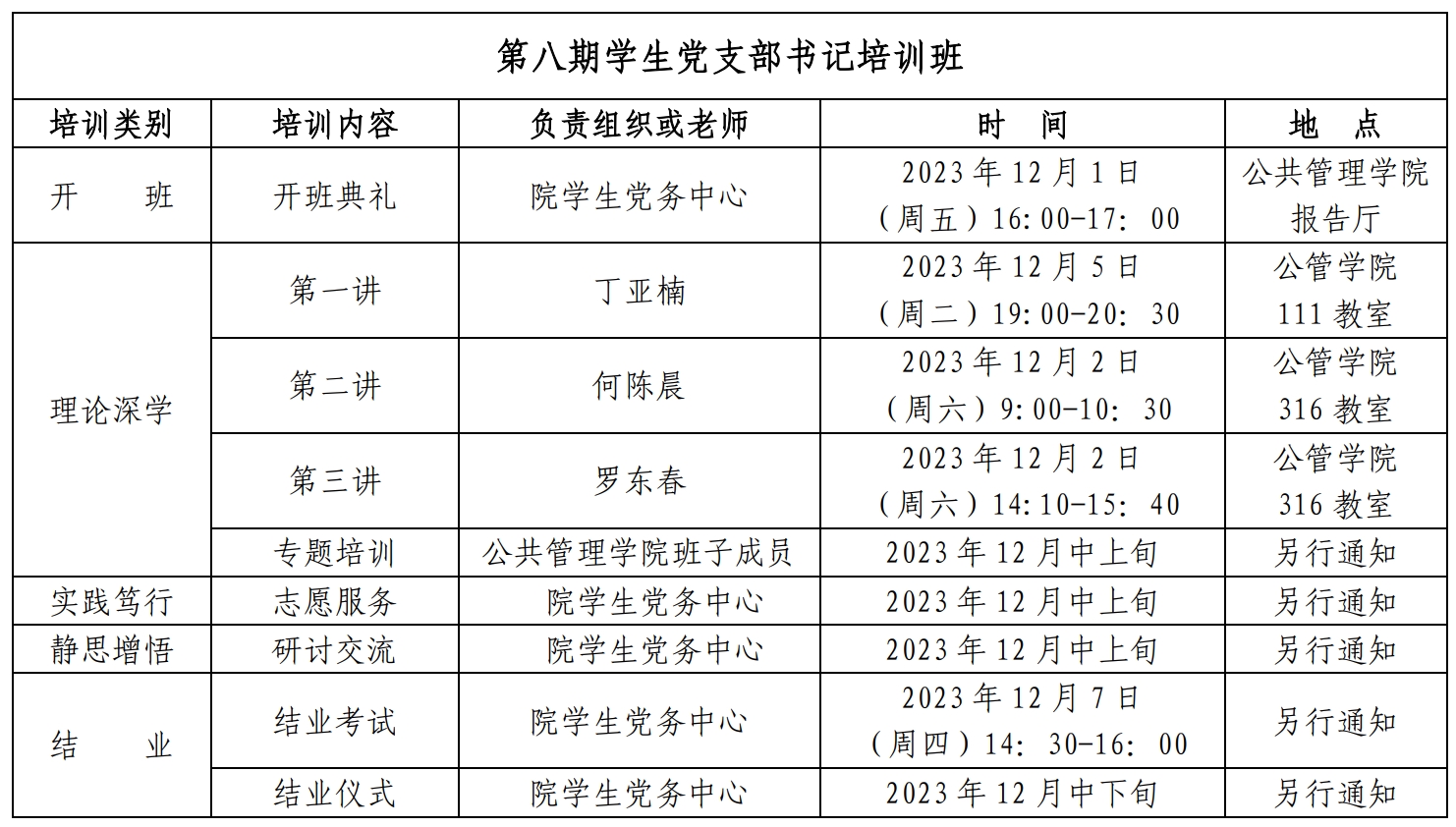 为深入学习贯彻习近平新时代中国特色社会主义思想,全面贯彻落实党的二十大精神,教育引导学院学生党支部书记学懂弄通党的性质、宗旨、纲领、任务、指导思想、组织原则和纪律要求,坚定树立为共产主义事业奋斗终身的信念,根据学校相关文件的规定和精神,公共管理学院、体育学院分党校拟举办第八期学生党支部书记培训班。现将相关安排通知如下: