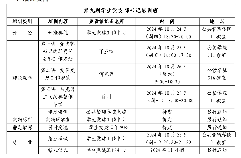 为深入学习贯彻习近平新时代中国特色社会主义思想,全面贯彻落实党的二十大精神,教育引导学院学生党支部书记学懂弄通党的性质、宗旨、纲领、任务、指导思想、组织原则和纪律要求,坚定树立为共产主义事业奋斗终身的信念,根据学校相关文件的规定和精神,公共管理学院、体育学院分党校拟举办第九期学生党支部书记培训班。现将相关安排通知如下: