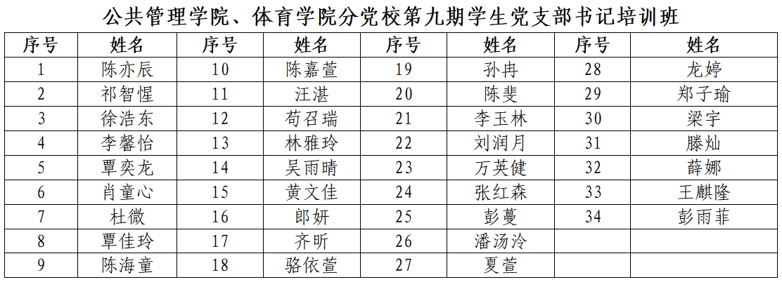 本期学生党支部书记培训班共有学员34人,人员名单如下: