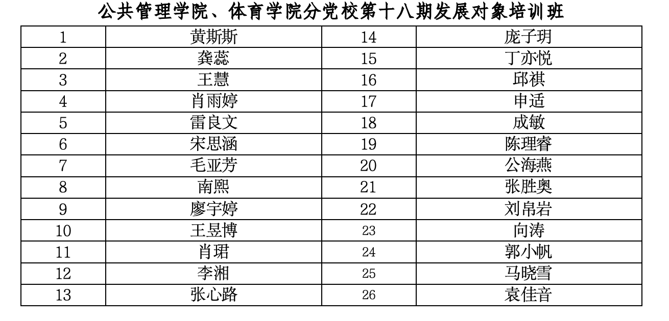 本期发展对象共有学员26人,综合考虑学院、年级、培训类别、所在党支部等因素,名单如下: