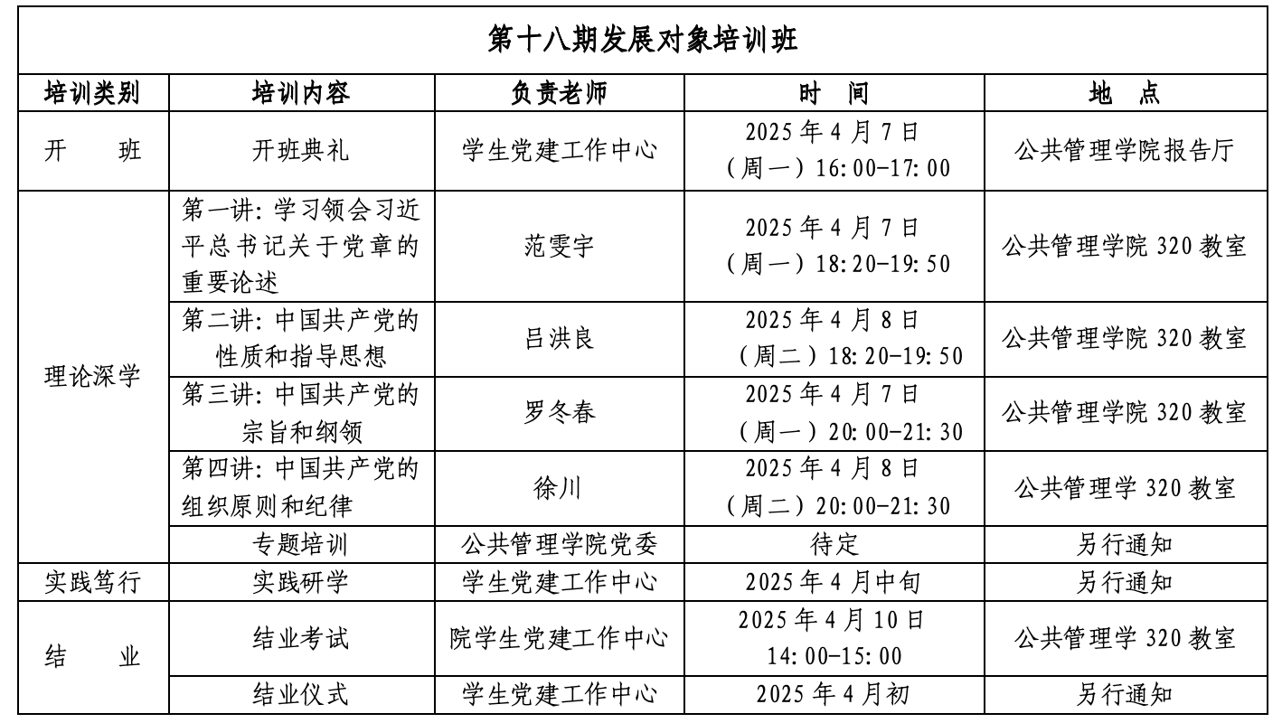 为深入学习贯彻习近平新时代中国特色社会主义思想,全面贯彻落实党的二十大精神,教育引导学院发展对象学懂弄通党的性质、宗旨、纲领、任务、指导思想、组织原则和纪律要求,坚定树立为共产主义事业奋斗终身的信念,根据学校相关文件的规定和精神,公共管理学院、体育学院分党校拟举办第十八期发展对象培训班。现将相关安排通知如下: