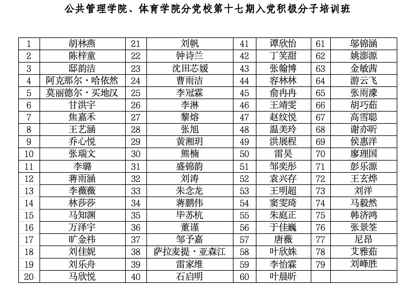 本期入党积极分子培训班共有学员79人,综合考虑学院、年级、培训类别、所在党支部等因素,名单如下: