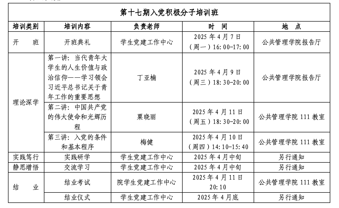 为深入学习贯彻习近平新时代中国特色社会主义思想,全面贯彻落实党的二十大精神,教育引导学院发展对象学懂弄通党的性质、宗旨、纲领、任务、指导思想、组织原则和纪律要求,坚定树立为共产主义事业奋斗终身的信念,根据学校相关文件的规定和精神,公共管理学院、体育学院分党校拟举办第十七期入党积极分子培训班。现将相关安排通知如下: