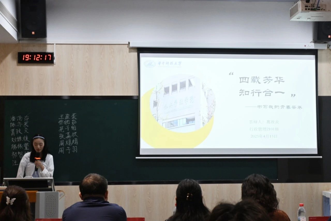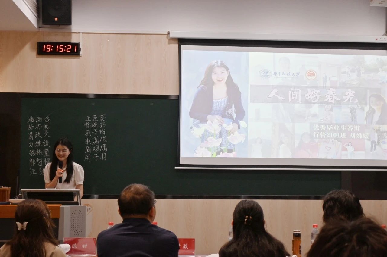 刘芳在倾听了同学们的青春故事后表示,这场答辩会不仅是十三份青春答卷的集中展阅,也是公管学子四年成长的生动缩影。她指出,学院与同学们见证了彼此的进步与成长,希望“准毕业生们”把优秀作为一种习惯,在新征程上敢于坚守、勇于突破;牢记公管人的使命担当,以公共情怀服务人民,以奋斗之姿建功立业,实现个人价值与家国发展的同频共振。她寄语大家,未来,同学们都将是华科大最亮眼的名片和骄傲。