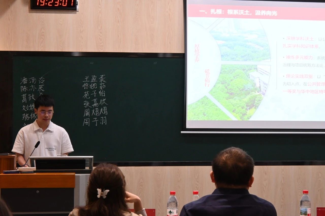 为积极营造向榜样看齐、向优秀学习的浓厚氛围,充分发挥先进榜样的示范引领作用,4月15日,公共管理学院开展2025届优秀本科毕业生答辩会。学院党委书记刘芳、副院长李菁、党委副书记粟晓丽、行政管理系系主任毛子骏、城市管理系系主任陈涛、本科生辅导员陈甜担任评委。行政管理专业2401班李爽主持答辩会。