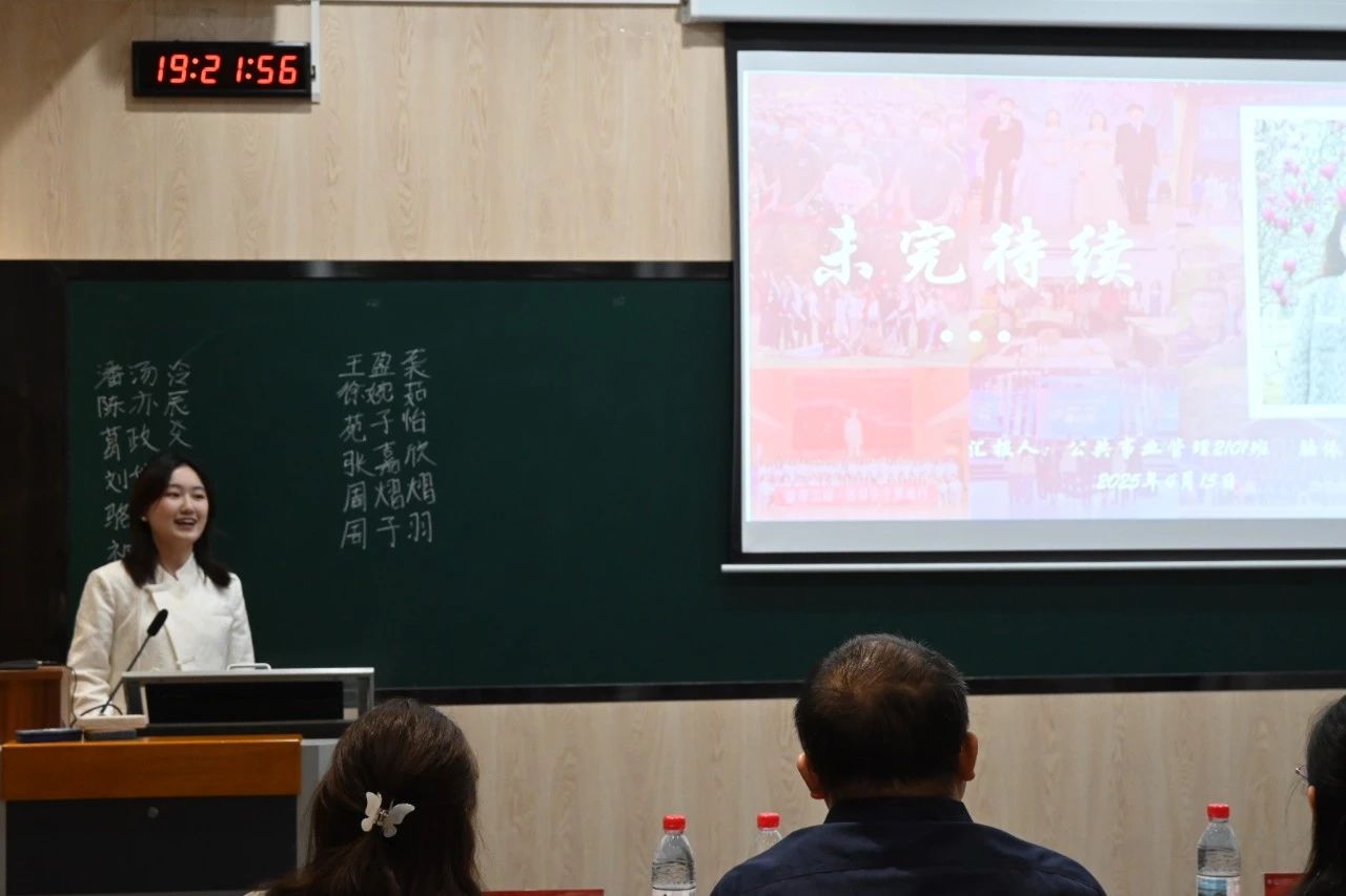 李菁回顾四年来同学们的荣誉与成长,表示优秀没有固定标准,每个人的成长经历都弥足珍贵。她谈到,走进公管学院,同学们以“领导者的摇篮,政府的思想库”为理念,在政策分析、组织管理、调研写作等领域沉淀学习;走出公管学院,希望同学们扩宽自己的学习视野,紧跟国内外发展趋势,在未来的工作生活中,以敏锐洞察力和辩证思维直面复杂挑战,做到理性判断、科学决策。