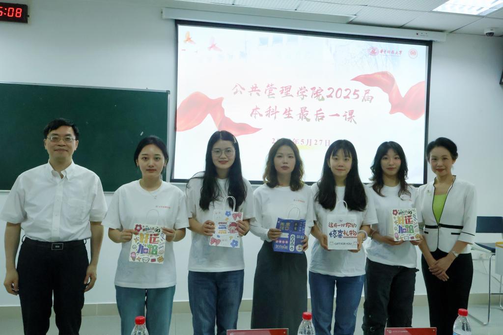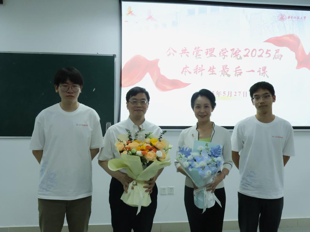 活动由毕委会成员陈亦辰主持。学生代表向两位老师赠送鲜花,感谢老师、学院和学校的悉心培养。两位老师向同学们赠送镌刻华科大公管记忆的纪念品,并激励同学们在未来的学习和工作中展现公管学子的担当,在党和人民需要的地方绽放绚丽的青春之花。