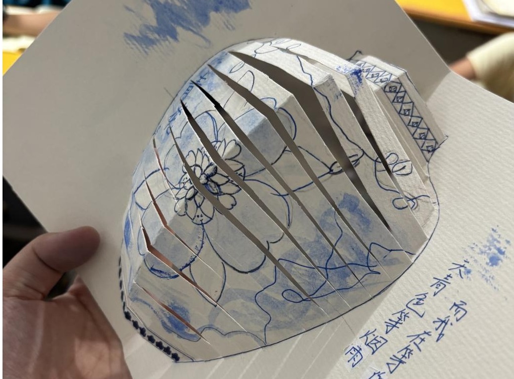 非遗扎染课上,蓝白丝线在水中晕染出自然纹样,孩子们在浸染间触摸千年染色的古朴;扭扭棒复刻非遗绒花,彩色绒线于指尖缠绕绽放,传递着绒花的雅致巧思;传统纸灯笼制作中,竹篾为骨、彩纸为衣,一盏盏巧手扎制的灯笼点亮了传统美学的微光;立体青花瓷纸雕环节,孩子们执刀雕琢、蓝笔勾勒,在层叠镂空与青花晕染里体会瓷纹的典雅风骨;皮影戏创作则聚焦孙悟空等经典形象,剪刻、敷彩、缀结,让沉睡的非遗故事在孩子们指尖“活”了起来。