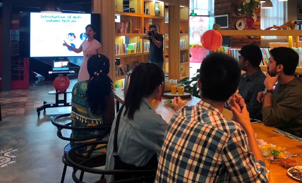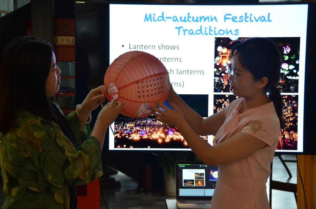 活动现场,张媛老师首先向国际学生由浅入深的介绍了中秋节的来历、传统习俗、相关传说,并请学生赏析了中秋相关的诗词。“但愿人长久,千里共婵娟”、“海上升明月,天涯共此时”,这些美妙的词句通过张老师的诠释,让国际学生们感同身受地理解了中秋节的内涵,并化解了他们身在异国他乡的思乡之情。介绍过程中,张媛老师通过教学生组装中秋灯笼、学习并朗诵《静夜思》、中秋知识小测验等互动形式,充分调动了国际学生学习的积极性和参与性。