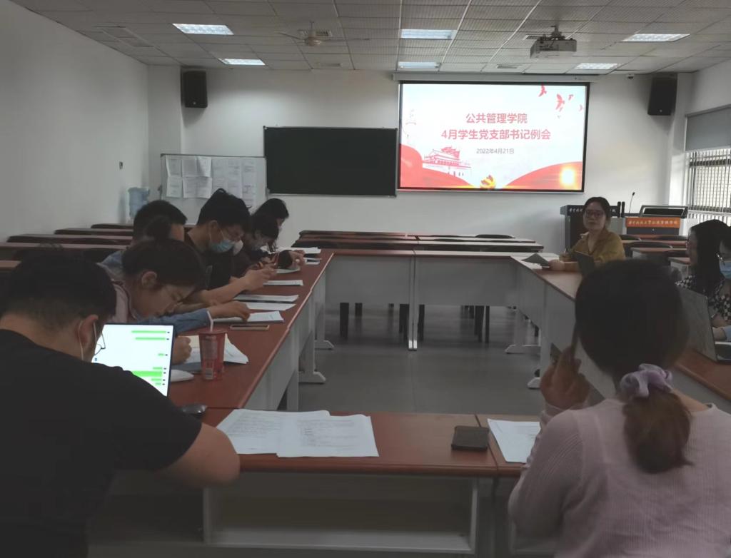 2022年4月21日下午15时,公共管理学院4月学生党支部书记例会于学院101会议室成功召开。学院党委副书记童文胜、研究生兼职辅导员陈甜、贺晓芳以及各本硕博学生党支部书记参加了本次例会。会议由贺晓芳同志主持。