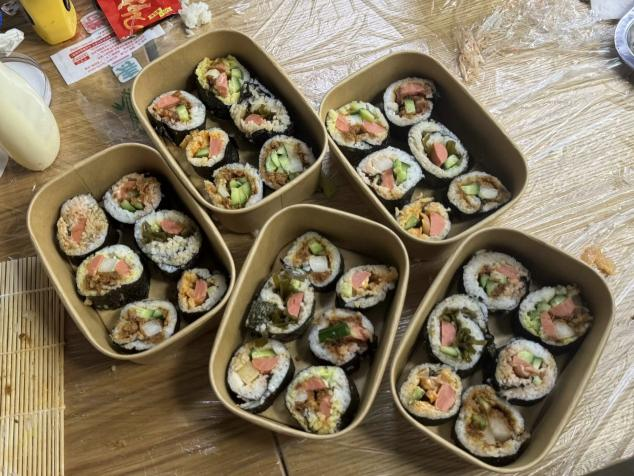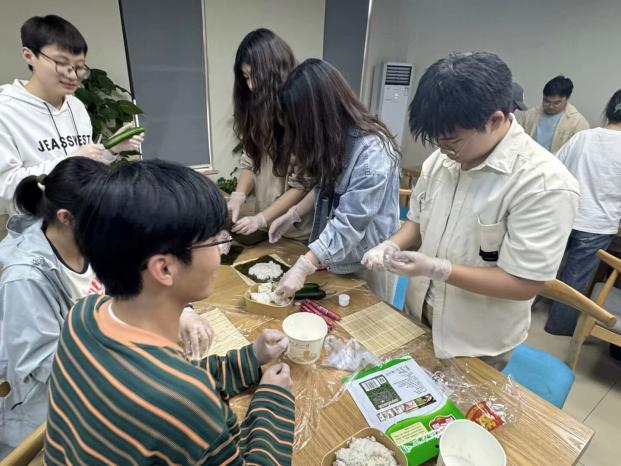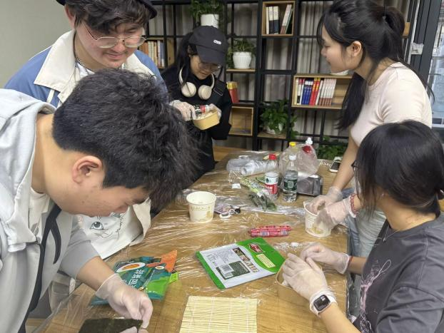 在劳动体验环节,同学们开展“春韵寿司绘”活动。你递紫菜我挖米饭,你捏饭团我切寿司,同学们自行发挥创意,动手铺海苔、摆放食材等,在巧妙搭配下卷起切成一个个漂亮的寿司卷。大家你一言我一语,现场氛围轻松快乐,每一个人都沉浸在互相帮助、劳动创造的快乐之中。