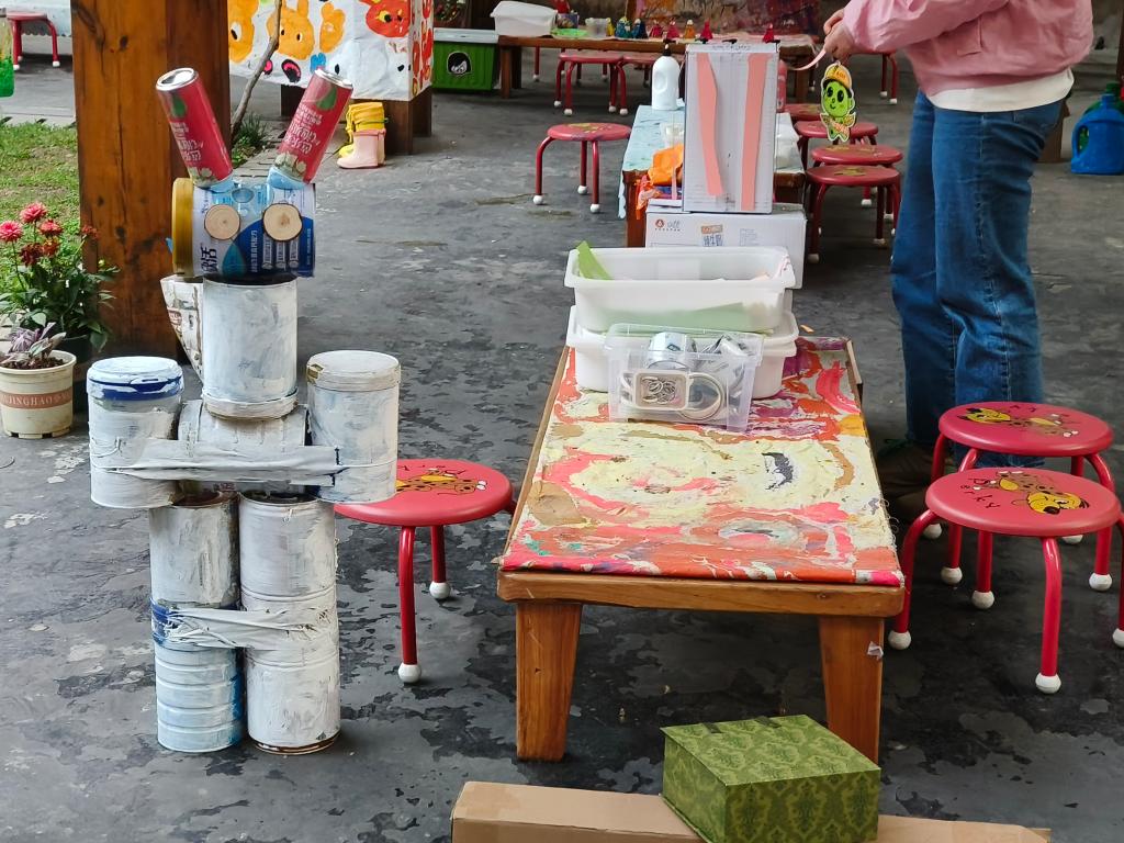 活动前夕,志愿者们提前抵达现场,细致布置活动场地:两顶普通的帐篷被巧妙装饰,瞬间化身为充满奇幻色彩的“创意魔法屋”;废旧奶粉罐重获新生,拼装成一个个可爱的卡通机器人;拼贴卡纸、环保颜料与工具分门别类摆放整齐,等待着小朋友们来一场创意的狂欢。志愿者们提前清洗绘画工具、模拟互动环节,保障每一个细节都能在传递环保知识的同时,还能激发孩子们无尽的探索热情。