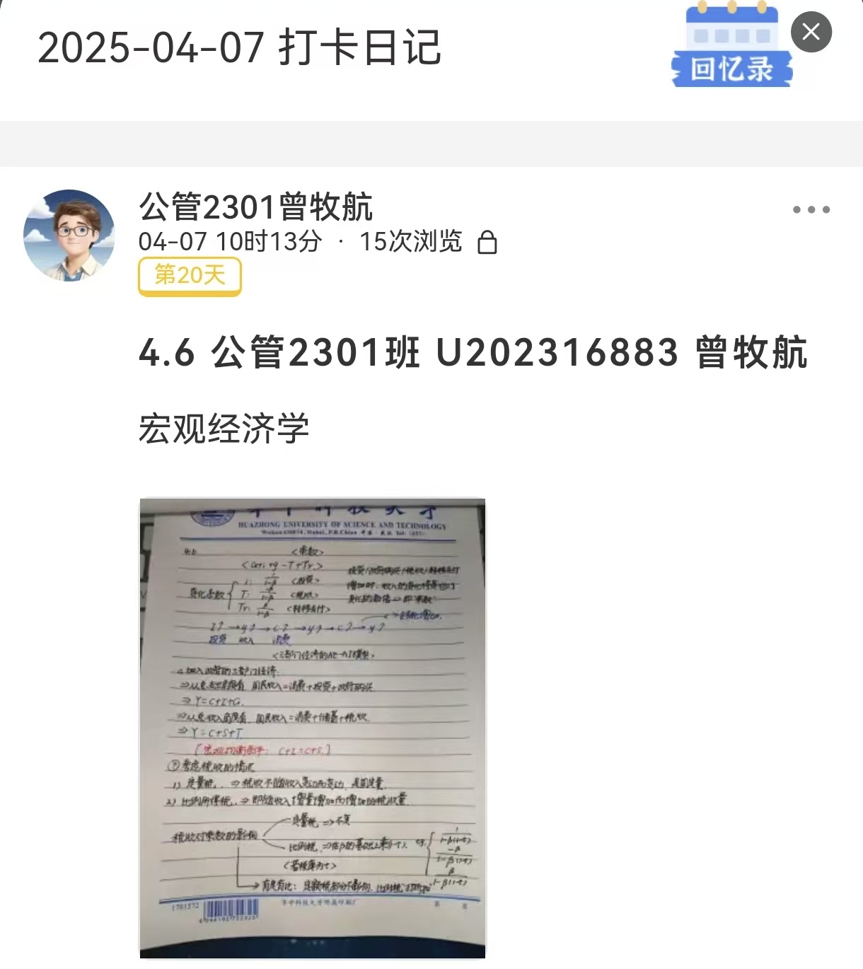 紧扣公共管理专业特色,同学们在课程学习中深入探索、主动思考,从《宏观经济学》的复杂理论,到《当代中国政治与政府》的深刻见解,再到《房地产管理》的实用体会,通过每日笔记打卡将繁杂的知识点进行系统梳理与条理归纳。在这个过程中,大家不仅实现了“学中记、记中思、思中进”,更将专业学习与良好习惯完美融合,让学习效率和知识掌握程度都得到了显著提升。
